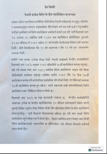 हामीले स्पष्ट रूपमा उल्लेख गरेका थियौं ’नेपाली कांग्रेसको केन्द्रीय कार्यसमितिले विधानको धारा १७(१) अनुसार २०८२ मंसिरभित्रै १५औं महाधिवेशन सम्पन्न गर्नुपर्छ। यदि त्यो सम्भव नभए १७ (२) बमोजिम विशेष महाधिवेशन आह्वान गरी विषम परिस्थितिको सम्बोधन गर्नुपर्छ।’