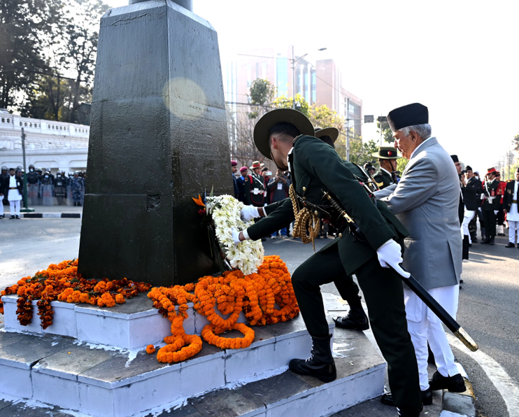 काठमाडौं, २७ पुस । राष्ट्रपति रामचन्द्र पौडेलले राष्ट्र निर्माता पृथ्वीनारायण शाहप्रति सम्मान व्यक्त गरेका छन् । सिंहदरबारको पश्चिमद्वार नजिक रहेको राष्ट्र निर्माताको सालिकमा पुष्पहार अर्पण गर्दै राष्ट्रपति पौडेलले उनको योगदानको सम्मान गरेका हुन् । त्यस अवसरमा नेपाली सेनाको एक टुकडीले राष्ट्रपतिप्रति सलामी अर्पण गरेको थियो ।