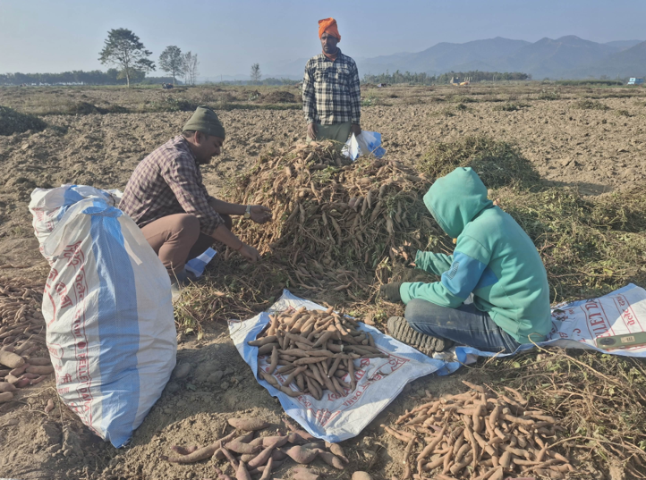 दाङ, ३० पुस । यहाँको देउखुरी राप्ती नदी उकास जमिन, पाँगो बलौटे माटो । बिहान पुसको चिसो सिरेटोको बेवास्ता नराखी किसान फरुवा चलाउँदै सखरखण्ड निकाल्न व्यस्त छन् । कोही सखरखण्ड खन्दै, कोही भने टिप्दै र थुपार्दैछन् भने कोही बजार पठाउनका लागि बोरामा भर्दैछन् । घरका परिवारले मात्र नभ्याउने भएपछि अन्य कामदार लगाएर किसान सखरखण्ड खनिरहेका छन् ।