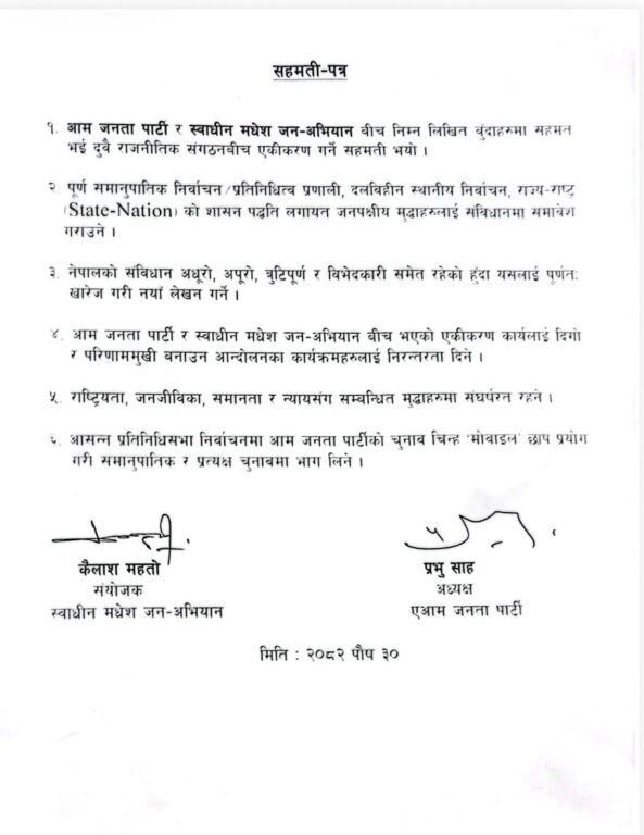 ‘आम जनता पार्टी र स्वाधीन मधेश जन–अभियान बीच भएको एकीकरण कार्यलाई दिगो र परिणाममुखी बनाउन आन्दोलनका कार्यक्रमहरुलाई निरन्तरता दिने । आसन्न प्रतिनिधिसभा निर्वाचनमा आम जनता पार्टीको चुनाव चिन्ह मोवाइल छाप प्रयोग गरी समानुपातिक र प्रत्यक्ष चुनावमा भाग लिने,’ दुवै पार्टीका प्रमुखले हस्ताक्षर गरेको पार्टी एकीकरण पत्रमा उल्लेख गरिएको छ ।