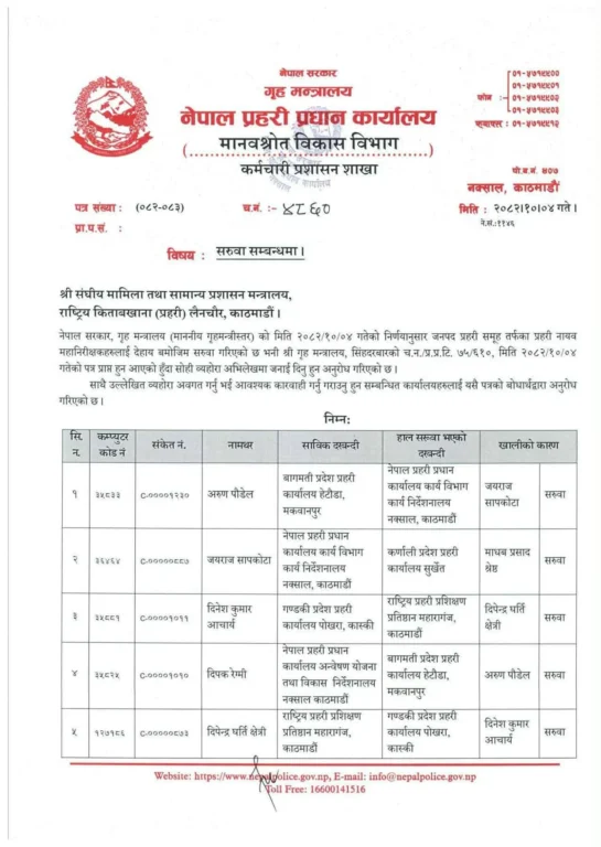 काठमाडौं, माघ ५ । नेपाल प्रहरीका आठ जना डीआईजीको सरुवा भएको छ । प्रहरी प्रधान कार्यालयले अरुण पौडेल, जयराज सापकोटा, दिनेश कुमार आचार्य र दीपक रेग्मी, दीपेन्द्र घर्ती क्षेत्री, भूपेन्द्रबहादुर खत्री, माधव प्रसाद श्रेष्ठ र राजेन्द्र प्रसाद भट्टको सरुवा गरेको हो ।