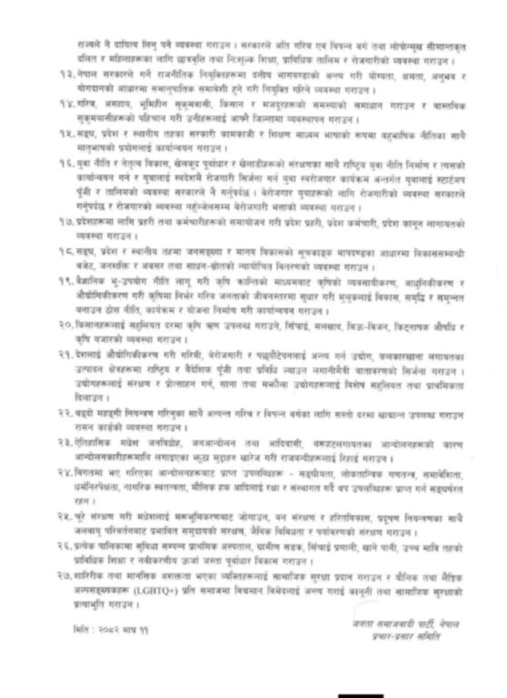 पार्टी नेतृत्वले घोषणापत्र जनताको अधिकार, पहिचान र समृद्धिका लागि मार्गचित्र भएको दाबी गर्दै जनतासँग समर्थनको अपिल गरेको छ।