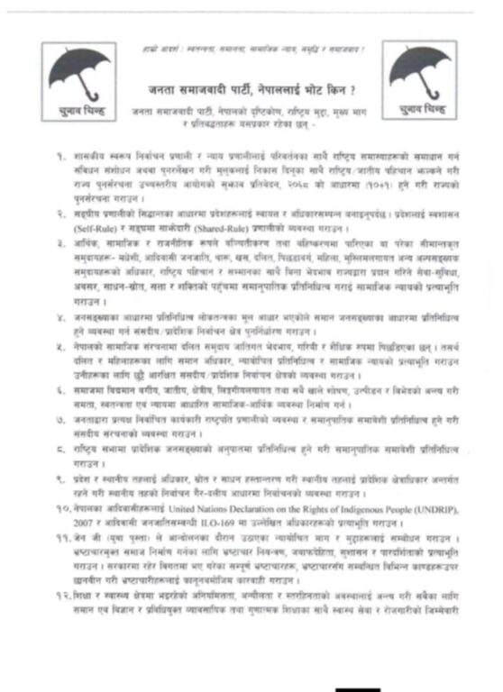 घोषणापत्रमा जनसंख्याका आधारमा निर्वाचन क्षेत्र पुनर्निर्धारण, दलित र महिलाका लागि छुट्टै आरक्षित निर्वाचन क्षेत्र, प्रत्यक्ष निर्वाचित कार्यकारी राष्ट्रपति प्रणाली, राष्ट्रिय सभामा जनसंख्याको अनुपातमा प्रतिनिधित्व, तथा स्थानीय तहको निर्वाचन गैरदलीय आधारमा गरिनुपर्ने प्रस्ताव समेटिएको छ।