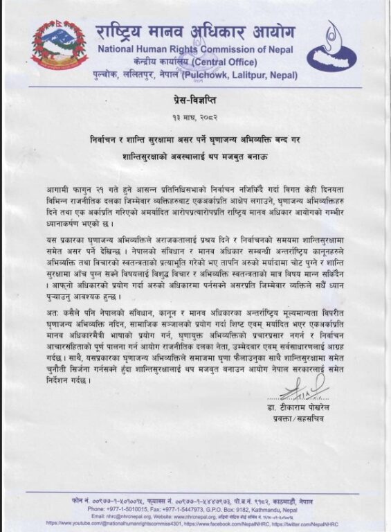 आयोगले त्यसप्रकारका घृणाजन्य अभिव्यक्तिले अराजकतालाई प्रश्रय दिने र निर्वाचनको समयमा शान्तिसुरक्षामा समेत असर पर्ने ठम्याएको छ । आयोगका प्रवक्ता डा. टिकाराम पोखरेलले आज एक विज्ञप्ती जारी गरेर यस्तो ध्यानाकार्षण गराएका हुन् । जहाँ भनिएको छ,‘नेपालको संविधान र मानव अधिकार सम्बन्धी अन्तर्राष्ट्रिय कानूनहरुले अभिव्यक्ति तथा विचारको स्वतन्त्रताको प्रत्याभूति गरेको भए तापनि अरुको मर्यादामा चोट पुग्ने र शान्ति सुरक्षामा आँच पुग्न सक्ने विषयलाई विशुद्ध विचार र अभिव्यक्ति स्वतन्त्रताको मात्र विषय मान्न सकिँदैन । आफ्नो अधिकारको प्रयोग गर्दा अरुको अधिकारमा पर्नसक्ने असरप्रति जिम्मेवार व्यक्तिले सधैँ ध्यान पु¥याउनु आवश्यक हुन्छ ।’