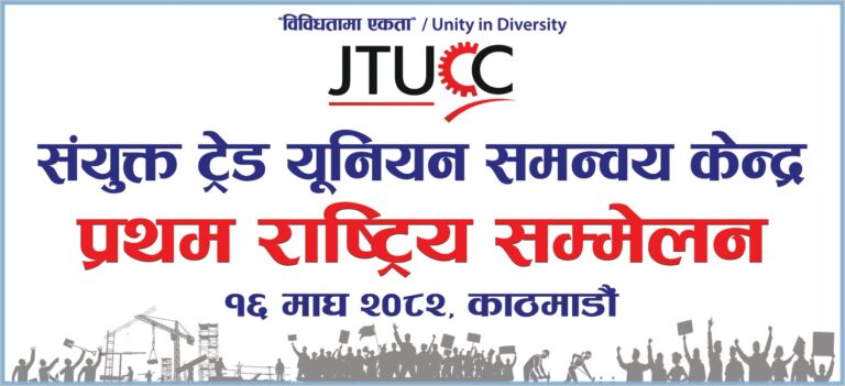 काठमाडौं, १५ माघ । संयुक्त ट्रेड युनियन समन्वय केन्द्र (जेटियुसिसी) को प्रथम सम्मेलन हुने भएको छ । श्रमिकहरुको साझा सङ्गठन जेटियुसिसीको प्रथम राष्ट्रिय सम्मेलन भोलि (माघ१६) देखि काठमाडौंस्थित होटल हार्दिकमा सुरु हुने समाजवादी ट्रेड युनियन महासङ्घका अध्यक्ष अर्जुन लम्सालले जानकारी दिए ।
