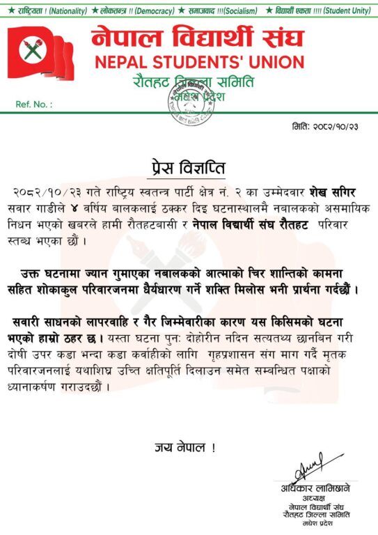 काठमाडौं, २४ माघ । नेपाल विद्यार्थी संघका रौतहट जिल्ला समितिका अध्यक्ष अधिकार लामिछानेले रास्वपाका रौतहट–२ का उम्मेदवार शेख सगिर सवार गाडीले चार वर्षीया बालिकालाई ठक्कर दिई घट्नास्थलमै ती बालिकाको असमायिक निधन भएको खबरप्रति दुःख व्यक्त गरेको छ ।