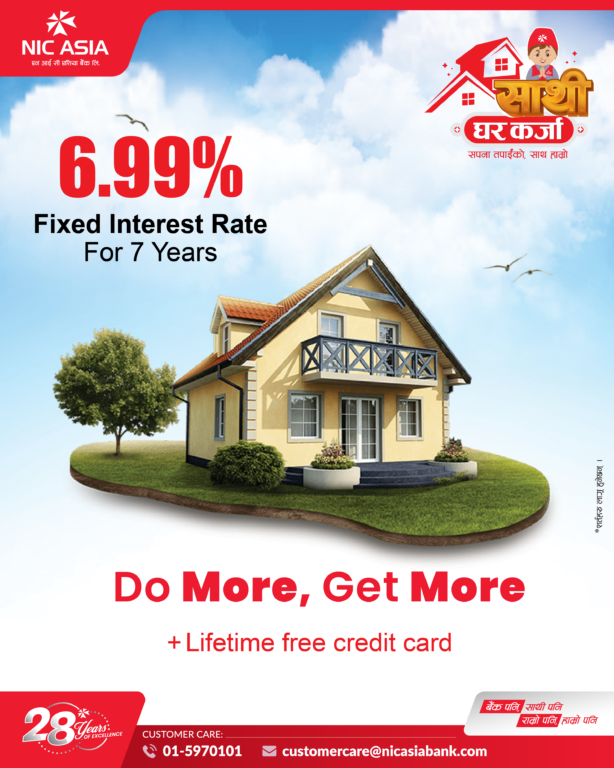 काठमाडौं, १ फागुन । एन आई सी एशिया बैंकले ग्राहकहरूको आवश्यकतालाई हरसम्भव पूरा गर्नका लागि रू. १० करोडसम्म घर कर्जा प्रदान गर्ने उद्देश्यअनुरुप ‘एन आई सी एशिया साथी घर कर्जा’ योजना सार्वजनिक गरेको छ । बैंकले सार्वजनिक गरेको यस घर कर्जा योजना अन्तर्गत ७ वर्षको लागि ६.९९ प्रतिशत स्थिर ब्याजदर एवं अन्य आकर्षक सेवा सहित उपलब्ध हुनेछ ।