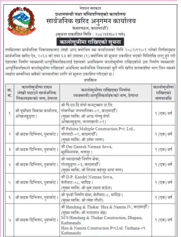 समयमै पूरा नगर्ने निर्माण कम्पनीलाई सार्वजनिक खरिद ऐन, २०६३ को दफा ६३ को उपदफा (१) बमोजिम कालो सूचीमा राखिएको सूचनामा उल्लेख छ।