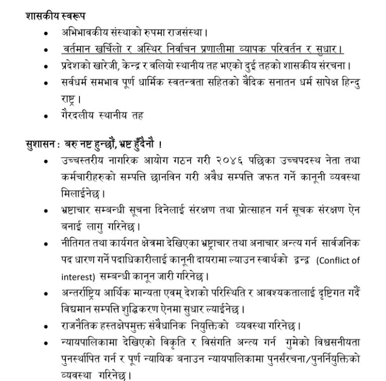 राप्रपाले सुशसानको सवालमा पनि आकर्षक नारा लिएको छ । उसले ‘बरु नष्ट हुन्छौं, भ्रष्ट हुँदैनौं’ भनेको छ । सुशासनको सवालमा उसले ०४६ सालपछिका उच्चपदस्थ नेता तथा कर्मचारीको सम्पत्ति छानविन गरी अवैध सम्पत्ति जफत गर्ने कानूनी व्यवस्था मिलाईने संकल्प गरेको छ ।