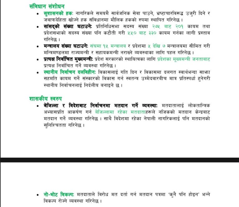 यस्तै, सांसद्को संख्या घटाउने कुरा पनि उसले आफ्नो चुनावी प्रतिबद्धतामा उल्लेख गरेको छ । अहिले कायम रहेको २७५ बाट २०१ ज्नाको सांसद संख्या कायम गरिनुपर्ने भनेको छ । यस्तै प्रदेशसभाको सदस्य संख्या पनि कटौती गरी ५५० बाट ३३० कायम गर्नको लागि प्रस्ताव गरिने कुरा उसले उल्ल्ेख गरेको छ ।