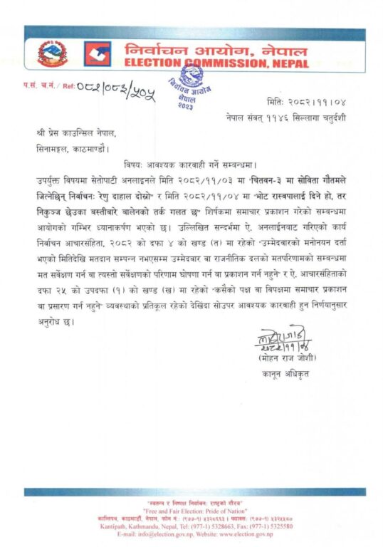 आयोगले काउन्सिललाई लेखेको पत्रमा भनिएको छ,‘उपर्युक्त विषयमा सेतोपाटी अनलाइनले मिति २०८२/११/०३ मा चितवन–३ मा सोविता गौतमले जित्नेछिन् निर्वाचनः रेणु दाहाल दोस्रो र मिति २०८२/११/०४ मा भोट रास्वपालाई दिने हो, तर निकुञ्ज छेउका बस्तीबारे वालेनको तर्क गलत छ शिर्षकमा समाचार प्रकाशन गरेको सम्बन्धमा आयोगको गम्भिर ध्यानाकर्षण भएको छ । उल्लिखित सन्दर्भमा ऐ. अनलाईनबाट गरिएको कार्य निर्वाचन आचारसंहिता, २०८२ को दफा ४ को खण्ड (त) मा रहेको उम्मेदवारको मनोनयन दर्ता भएको मितिदेखि मतदान सम्पन्न नभएसम्म उम्मेदवार वा राजनीतिक दलको मतपरिणामको सम्बन्धमा मत सर्वेक्षण गर्न वा त्यस्तो सर्वेक्षणको परिणाम घोषणा गर्न वा प्रकाशन गर्न नहुने र ऐ. आचारसंहिताको दफा २५ को उपदफा (१) को खण्ड (ख) मा रहेको कसैको पक्ष वा विपक्षमा समाचार प्रकाशन वा प्रसारण गर्न नहुने व्यवस्थाको प्रतिकूल रहेको देखिदा सोउपर आवश्यक कारवाही हुन निर्णयानुसार अनुरोध छ ।’