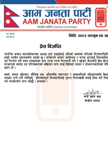 काठमाडौं, फागुन ५ । आम जनता पार्टी (आजपा)ले नागरिक बचाउ महाअभियानका संयोजक तथा मेडिकल व्यवसायी दुर्गा प्रसाईंलाई गरिएको गिरफ्तारीप्रति गम्भीर आपत्ति जनाएको छ।