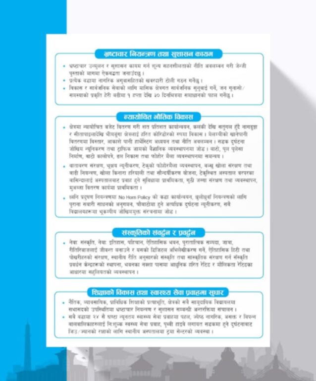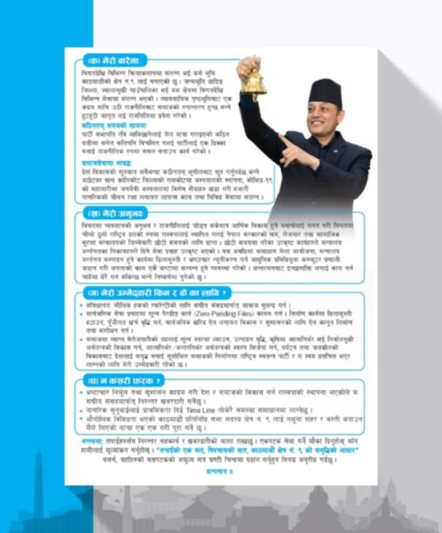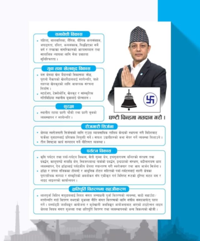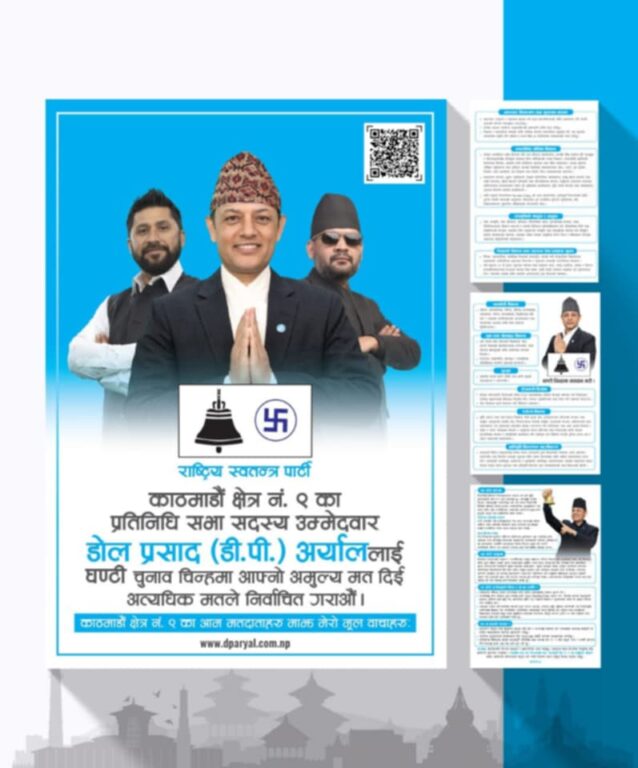 काठमाडौं, ५ फागुन । रास्वपाका उपसभापति तथा काठमाडौं–९ का प्रतिनिधिसभा सदस्य उम्मेदवार डिपी अर्यालले आफ्नो चुनावी वाचापत्र सार्वजनिक गरेका छन् । उनले ‘तपाईंको एक मत, विश्वासको सार, काठमाडौँ क्षेत्र नम्बर ९ को समृद्धिको आधार’ भन्ने नारा तय गरिएको छ । उनले आफ्नो वाचापत्रमा भ्रष्टाचार नियन्त्रणलाई पहिलो प्राथमिकता राख्दै शून्य सहनशीलताको नीति अपनाउने र प्रत्येक वडामा नागरिक अगुवासहितको खबरदारी टोली गठन गर्ने प्रतिबद्धता जनाएका छन्।
