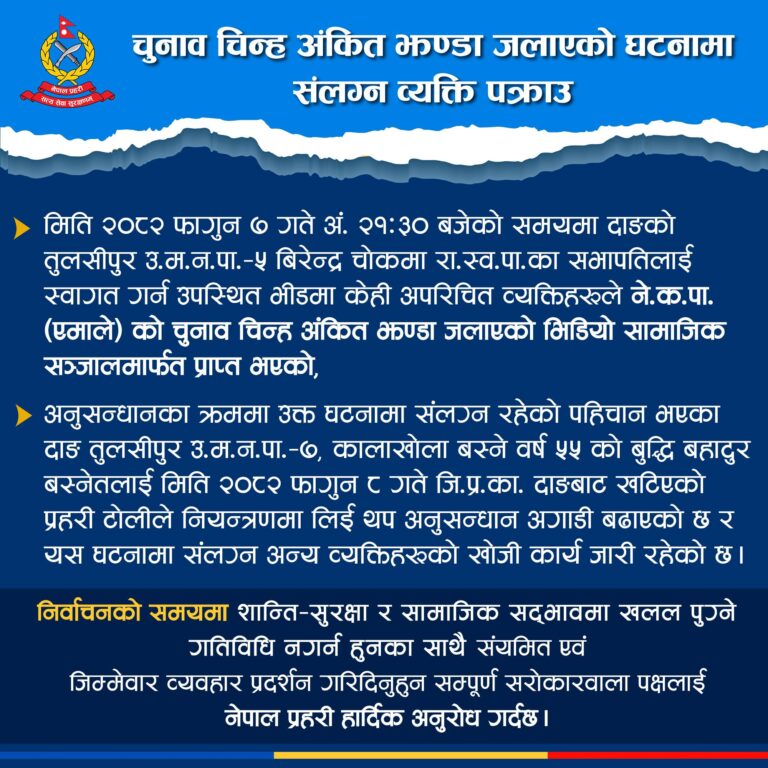 प्रहरीले अनुसन्धानको क्रममा घट्नामा संलग्न रहेको पहिचान भएका तुलसीपुर कालाखोला बस्ने वर्ष ५५ को बुद्धि बहादुर बस्नेतलाई आज पक्राउ गरेको हो । प्रहरीले यो घटनामा संलग्न अन्य व्यक्तिहरुको पनि खोजी कार्य जारी रहेको जनाएको छ । निर्वाचनको समयमा शान्ति–सुरक्षा र सामाजिक सद्भावमा खलल पुग्ने गतिविधि नगर्नको लागि अनुरोध गरेको छ ।