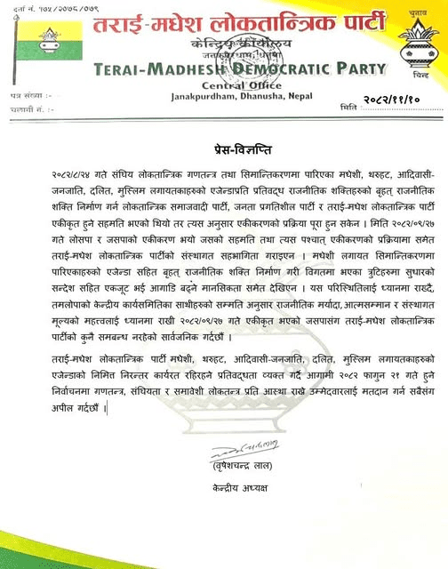 उनले जारी गरेको विज्ञप्तिमा भनिएको छ,‘तराई–मधेश लोकतान्त्रिक पार्टी मधेशी, थरुहट, आदिवासी–जनजाति, दलित, मुस्मिललगायतकाहरुको एजेण्डाको निम्ति निरन्तर कार्यरत ररिहने प्रतिबद्धता व्यक्त गर्दै आगामी २०८२ फागुन २१ गते हुने निर्वाचनमा गणतन्त्र, संघीयता र समावेशी लोकतन्त्रप्रति आस्था राख्ने उम्मेदवारलाई मतदान गर्न सवैसँग अपिल गर्दछौं ।’