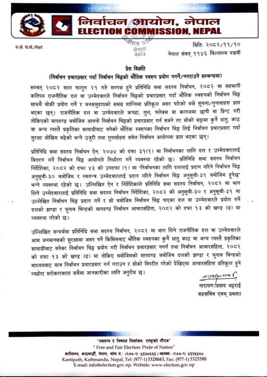 २१ फागुनमा हुने निर्वाचनमा उम्मेदवार र राजनीतिक दलहरुले भौतिक स्वरुपको निर्वाचन चिह्न साथमै बोकी प्रयोग गर्ने र जनसमूदायको समग्र शान्तिमा प्रतिकूल असर पारेको भन्ने सूचना तथा गुनासा प्राप्त भएको उल्लेख गर्दै ती राजनीतिक दल र उम्मेदवारलाई कपडा, तुल, फ्लेक्स वा कागजमा छापी वा प्रिन्ट गरी तोकिएको मापदण्डबमोजिम आफ्नो निर्वाचन चिह्नको प्रचारप्रसार गर्नसक्ने र सोको सट्टामा कुनै धातु, काठ वा अन्य त्यस्तै प्रकृतिका सामाग्रीबाट बनेको भौतिक स्वरुपका निर्वाचन चिह्न लिई निर्वाचन प्रचारप्रसार गर्दा सुरक्षा जोखिम बढेको भन्ने उजुरी तथा गुनासोहरु समेत निर्वाचन आयोगमा प्राप्त भएको उल्लेख गरेको छ ।
