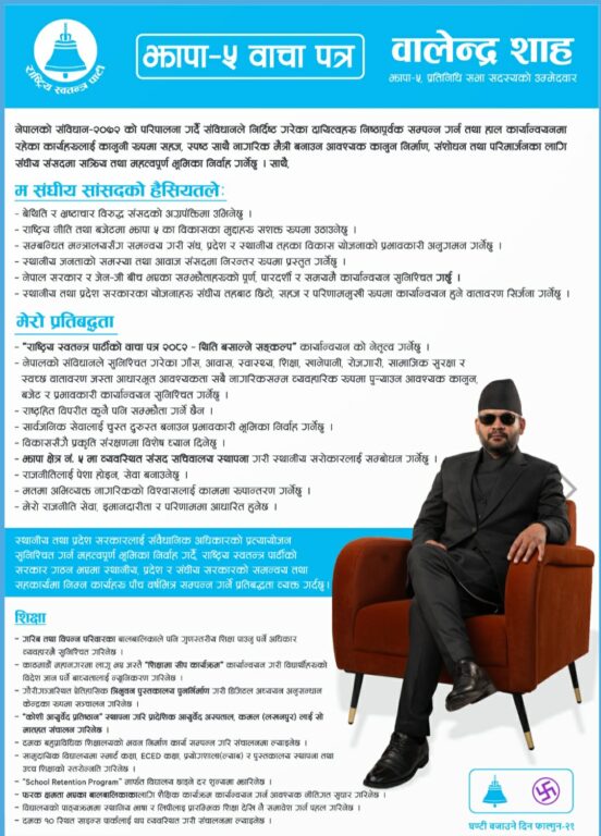 काठमाडौं, फागुन ११ । राष्ट्रिय स्वतन्त्र पार्टी (रास्वपा) बाट झापा क्षेत्र नम्बर ५ का प्रतिनिधि सभा सदस्य उम्मेदवार बालेन्द्र शाह (बालेन) ले सोमबार आफ्नो चुनावी वाचा पत्र सार्वजनिक गरेका छन्। उनले बेथिति र भ्रष्टाचारविरुद्ध संसदमा सशक्त रूपमा उभिनेु मुख्य संकल्प गर्दै शिक्षा, स्वास्थ्य, कृषि र पूर्वाधार विकासलाई प्राथमिकतामा राख्दै आफ्नो वाचापत्रमा नीति निर्माण र कानुनी सुधारमा सक्रिय रहने प्रतिबद्धता जनाएका छन्।