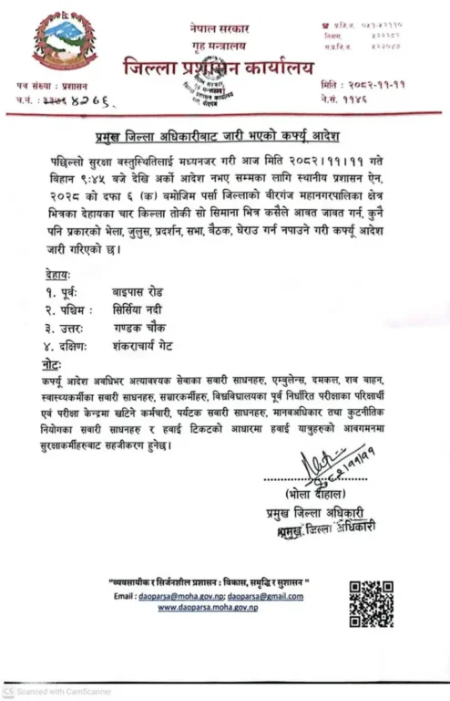 काठमाडौं, फागुन ११ । जिल्ला प्रशासन कार्यालय पर्साले पर्साको वीरगञ्ज महानगरपालिका क्षेत्रमा सुरक्षा अवस्था गम्भीर बनेपछि आज बिहानैदेखि अनिश्चितकालीन कर्फ्यू आदेश जारी गरेको छ।