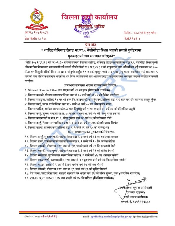 धादिङ बस दुर्घटना : मृतक सबैको सनाखत