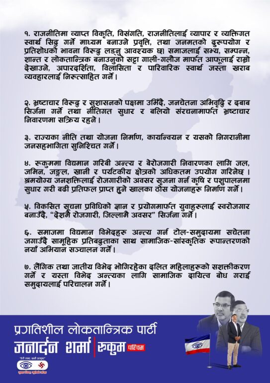 काठमाडौं, १२ फागुन । प्रगतिशील लोकतान्त्रिक पार्टीका संरक्षक तथा रुकुम-पश्चिमका उम्मेदवार जनार्दन शर्माले आफ्नो चुनावी प्रतिबद्धता सार्वजनिक गरेका छन् । २१ फागुनमा हुने प्रतिनिधिसभा निर्वाचनको लागि उनले २१ वटा प्रतिबद्धता सार्वजनिक गरेका हुन् ।