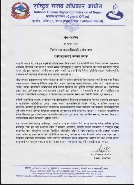 मानवअधिकार आयोगले भन्यो : निर्वाचनमा बालबालिकाको प्रयोग नगर (विज्ञप्तिसहित)