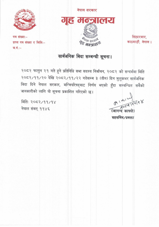 गृह मन्त्रालयका प्रवक्ता सहसचिव आनन्द काफ्लेले आज एक सूचना जारी गर्दै फागुन २० गतेदेखि फागुन २२ गतेसम्म तीन दिन सार्वजनिक बिदाको निर्णय भएको जनाएका छन् ।