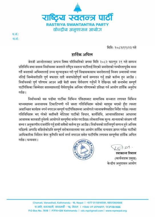 आज आयोगका कार्यवाहक प्रमुख रमाकान्त रिमालले एक अपिल जारी गरेर यस्तो भनेका हुन् । अपिलमा भनिएको छ,‘जेनजी आन्दोलनबाट उत्पन्न विषम परिस्थितिको जगमा मिति २०८२ फाल्गुन २१ गते सम्पन्न प्रतिनिधि सभा सदस्य निर्वाचनमा जनताले राष्ट्रिय स्वतन्त्र पार्टीलाई दिएको जनादेशको गम्भीरतापूर्वक मनन गर्दै जनताको अभिमतलाई उच्च मूल्याङ्कन गरी पूर्ण विश्वासकासाथ जनादेशलाई विजय उन्मादको रुपमा नलिई जिम्मेवारीप्रति पूर्ण बफादार रहदै जवाफदेहीपूर्ण कार्य सम्पादन गर्नु हाम्रो कर्तव्य हुन आउँछ । निर्वाचनको पूर्ण परिणाम आउन अझै केही समय धैर्यधारण गर्नुपर्ने नै देखिन्छ। यसै सन्दर्भमा सम्पूर्ण पार्टीपंक्तिका जिम्मेवार सदस्यहरुलाई धैर्यतापूर्वक अन्तिम परिणामको प्रतिक्षा गर्न आयोग हार्दिक अनुरोध गर्दछ ।’