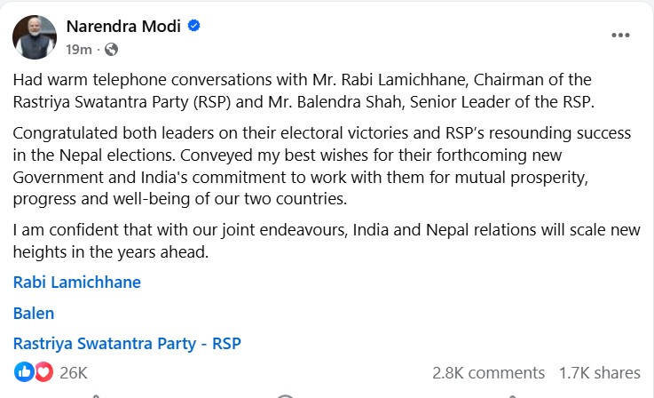 रास्वपाले आफ्नो नेतृत्वमा लागेको नयाँ सरकार बनाउन लागेकोमा पनि मोदीले शुभकामना दिएको बताएका छन् । मोदीले फेशबुकमार्फत लामिछाने र शाहसँग फोन सम्वाद गरेको जानकारी दिएका हुन् ।