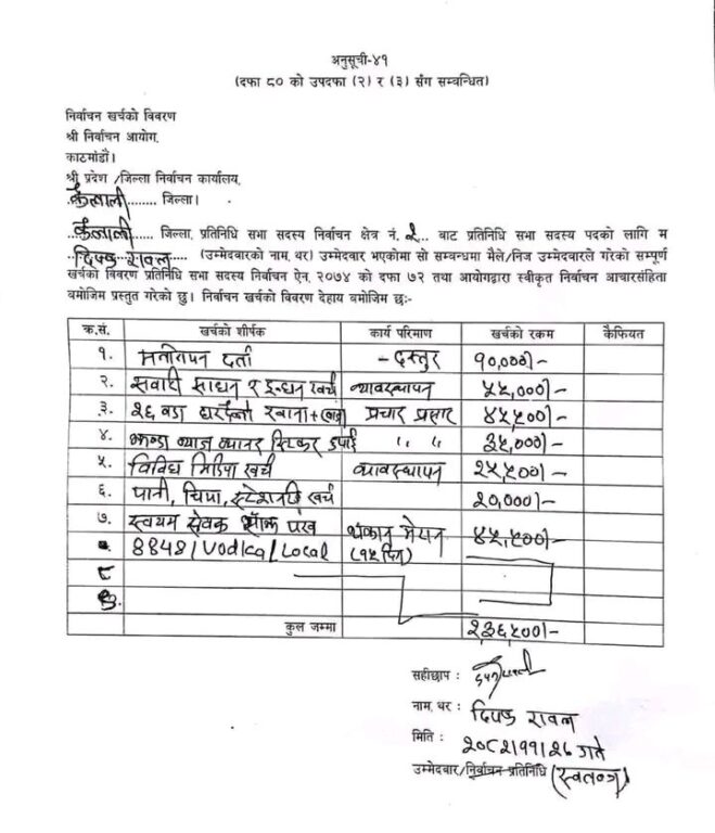 सुशासन, भ्रष्टाचारविरुद्धको अभियान, नागरिक अधिकार र जनताको आवाज संसदसम्म पुर्‍याउने दृढ अठोटसहित उम्मेदवारी दिएको जनाएका रावलको यस्तो छ खर्चको हिसाब:
