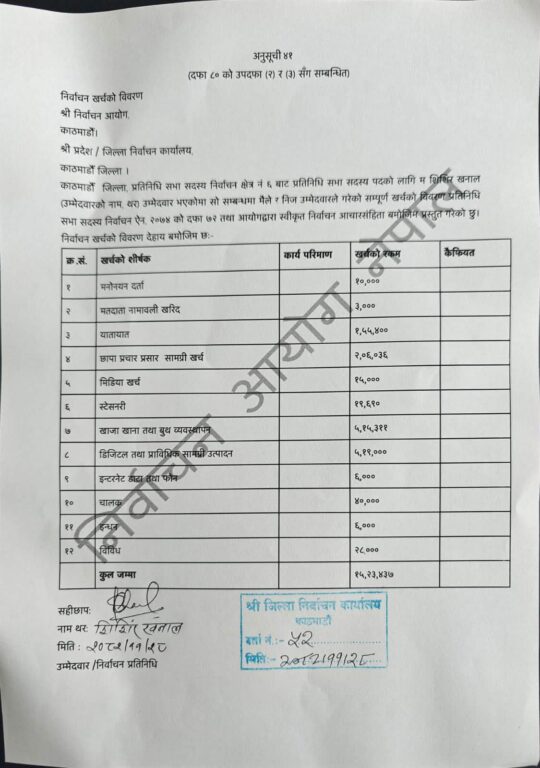 खनालले सबैभन्दा बढि खर्च डिजिटल तथा प्रावधिक सामाग्री उत्पादनमा खर्च गरेका छन् । उनले त्यसमा ५ लाख १९ हजार रुपैयाँ खर्च गरेका छन् । यस्तै, दोस्रो बढि खर्च भने खाजा, खाना तथा बुथ व्यवस्थापनमा गरेका छन् । यो शीर्षकमा उनले ५ लाख १५ हजार ३११ रुपैयाँ खर्च गरेका छन् ।