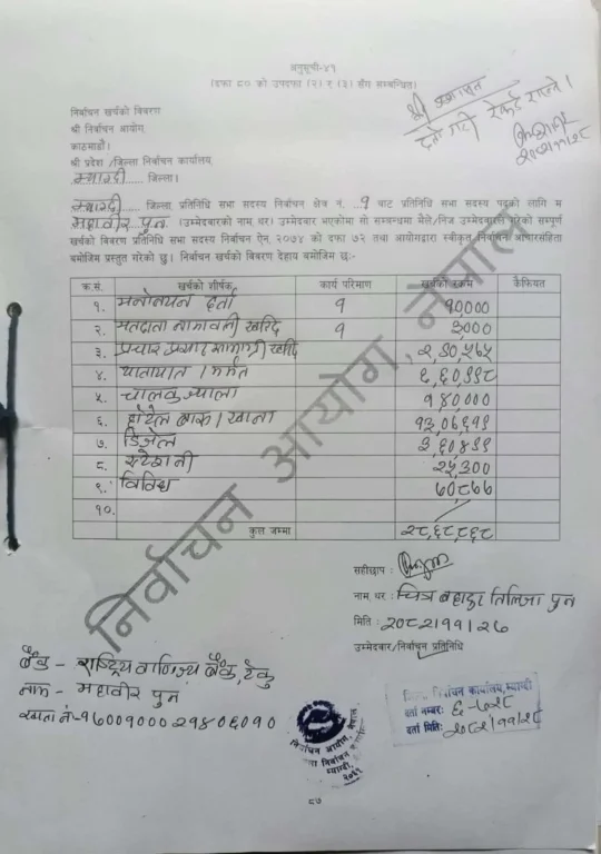 यो शीर्षकमा उनले १३ लाख सात हजार ६१९ खर्च गरेको उल्लेख गरेका छन् । यस्तै, चालक ज्यालामा करिब १ लाख ४० हजार रुपैयाँ, यातायातमा ६ लाख ६० हजार ९९८ रुपैयाँ खर्च गरेको पुनले उल्लेख गरेका छन् ।