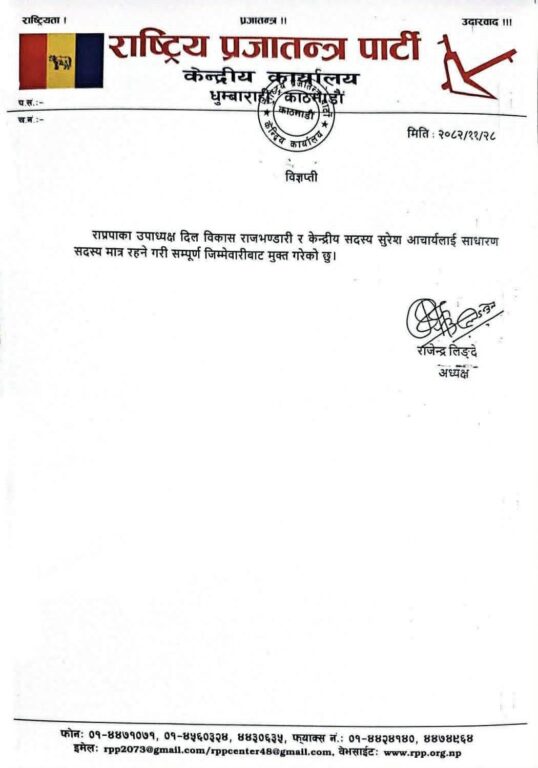 लिङ्देनद्वारा जारी विज्ञप्तिमा उल्लेख छ, ‘राप्रपाका उपाध्यक्ष दिलविकास राजभण्डारी र केन्द्रीय सदस्य सुरेश आचार्यलाई साधारण सदस्य मात्र रहने गरी सम्पूर्ण जिम्मेवारीबाट मुक्त गरेको छु ।’