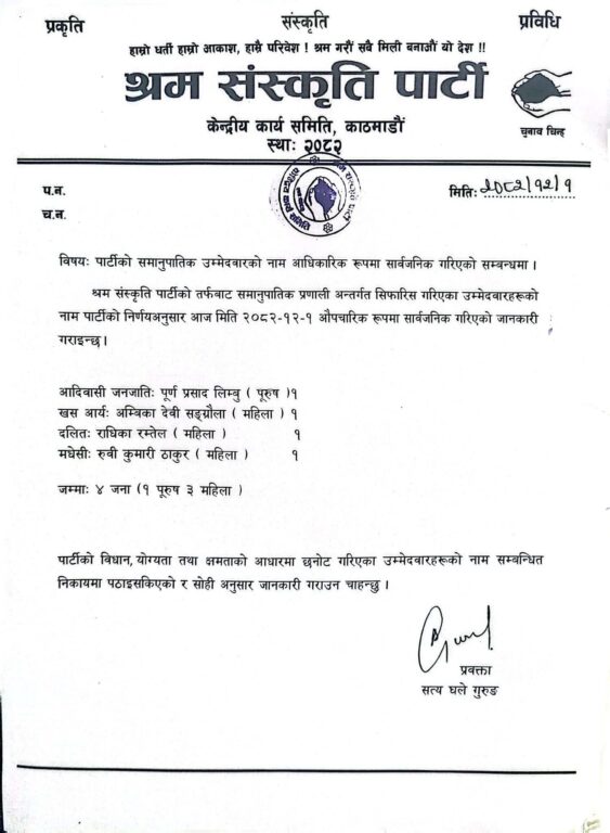 काठमाडौं, १ चैत्र । श्रम संस्कृति पार्टीले समानुपातिकतर्फ प्राप्त चार सिटमा सांसदहरुको नाम सिफारिश गरेको छ ।