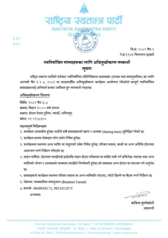 काठमाडौं, २ चैत्र । २१ फागुनमा सम्पन्न भएको निर्वाचनमा अभुतपूर्व सफलता हात पार्दै पहिलो दल बनेको रास्वपाले पार्टीबाट निर्वाचित सांसदहरुलाई अभिमुखीकरण कार्यक्रम राखेको छ । ललितपुरको रोयल टुलिप होटेलमा चल्ने दुई दिने अभिमुखीकरण कार्यक्रममा प्रशिक्षणमा आउने सांसदहरूलाई रास्वपाले ६ बुँदे निर्देशन जारी गरेको छ।