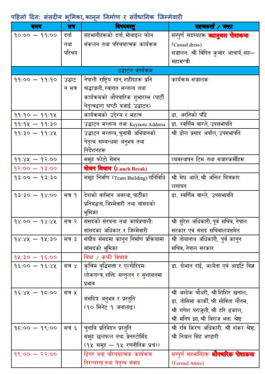 सार्वजनिक कार्यक्रम अनुसार आज पहिलो दिन संसदीय अभ्यास र अनुभव आदानप्रदान हुँदैछ । आज अभिमुखीकरण कार्यक्रमको उद्घाटन लगत्तै डा. अरनिको भण्डरीले कार्यक्रमको उदेश्य र महत्वबारे प्रकाश पार्नेछन् । त्यसपछि पार्टीका उपसभापति डा स्वर्णिम वाग्लेले किनोट मन्तव्य राख्नुका साथै देशको वर्तमान अवस्था र सांसदको भूमिकाबारे प्रस्तुति दिनेछन्। अर्का उपसभापति डोल प्रसाद अर्यालले चुनावी अभियानको अनुभव साट्नेछन्।