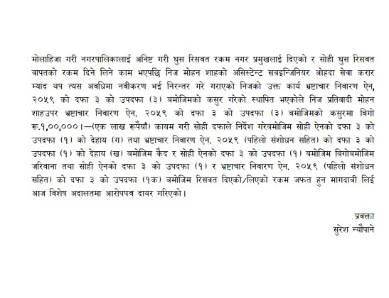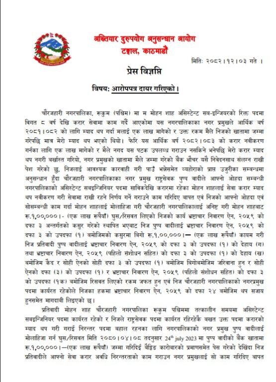 करार सेवामा कार्यरत कर्मचारी मोहन शाहको म्याद थप गरिदिएबापत एक लाख रुपैयाँ घुस लिएको अभियोगमा आयोगले मेयर वादीसहित घुस दिने कर्मचारीविरुद्ध आज विशेष अदालतमा आरोपपत्र दायर गरेको हो।