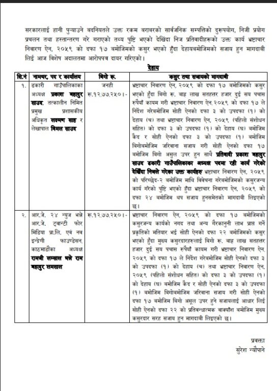 गाउँपालिकाका अध्यक्ष साउद, निमित्त प्रमुख प्रशासकीय अधिकृत लक्ष्मण साह र लेखापाल विमल साउदविरुद्ध सार्वजनिक सम्पत्ति दुरुपयोग गरी भ्रष्टाचार गरेको अभियोगमा मुद्दा दायर गरिएको अख्तियारले जनाएको छ । त्यस्तै आरजे ट्वान्टी फोर न्युज एवं नव इन्द्रेणी फाउन्डेसनका अध्यक्ष रामजी लम्सालविरुद्ध पनि मुद्दा दायर भएको छ ।