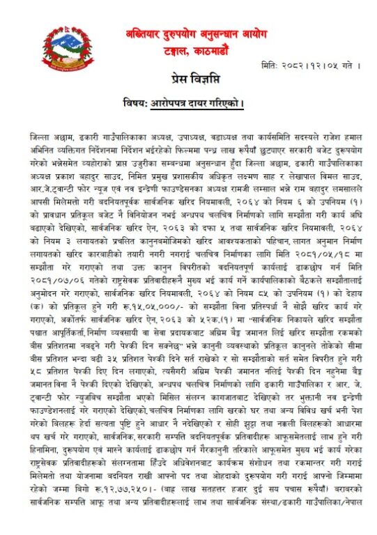 काठमाडौं, ५ चैत्र । अछामको ढकारी गाउँपालिकाका अध्यक्ष प्रकाश बहादुर साउदसमेत ४ जनाउपर सार्वजनिक सम्पत्ति हानी नोक्सानी पुर्याई भ्रष्टाचार गरेको सम्बन्धी आरोपपत्र दायर भएको छ । अख्तियारले आज साउदसहित ती चार जनाविरुद्ध विशेष अदालतमा भ्रष्टाचारसम्बन्धी मुद्दा दायर गरेको हो ।
