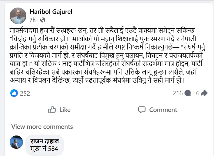 काठमाडौं, ७ चैत्र । नेपाली कम्युनिष्ट पार्टीबाट कारबाहीमा परेका नेता तथा पूर्वमन्त्री हरिबोल गजुरेलले संघर्ष गर्नु प्रगति र विजयको मार्ग भएको बताएका छन् । उनले संघर्षबाट विमुख हुनु पलायन, विघटन र पराजयतर्फको यात्रा भनेका छन् । उनले जहाँ अन्याय र विचलन हुन्छ त्यहाँ दृढतापूर्वक संघर्षमा उत्रिनु नै सही मार्ग हो भनेका छन् ।