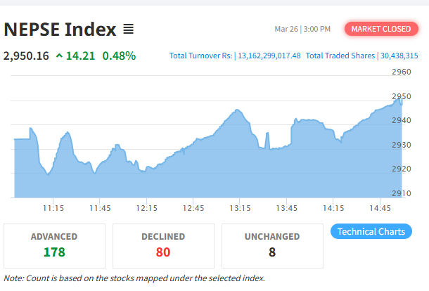 काठमाडौँ, १२ चैत । साताको अन्तिम कारोबार दिन नेप्से परिसूचक बढेर बन्द भएको छ। बुधबार घटेर बन्द भएको नेप्से बिहीबार १४.२१ अंकले बढेर २९५०.१६ विन्दुमा पुगेको छ। यसैगरी, सेन्सेटिभ इन्डेक्स १.९८ अंक, फ्लोट इन्डेक्स १.०३ अंक र सेन्सेटिभ फ्लोट इन्डेक्स ०.७२ अंकले वृद्धि भएको छ।यद्यपि, नेप्से बढ्दा पनि कारोबार रकम सामान्य घटेको छ।