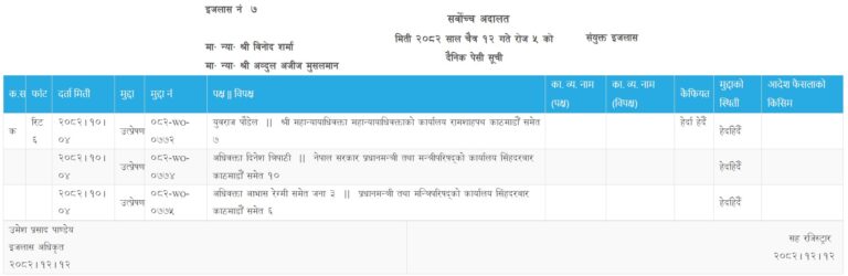 सर्वोच्च अदालतका न्यायाधीशद्वय विनोद शर्मा र अब्दुल अजिज मुसलमानको संयुक्त इजलासमा सुनुवाई भएकोमा आजपनि हेर्दाहेर्दैमा परेको छ । आज महान्यायाधिवक्ता कार्यालयको तर्फबाट सरकारी वकिलहरूले जवाफी बहस गरेका थिए ।