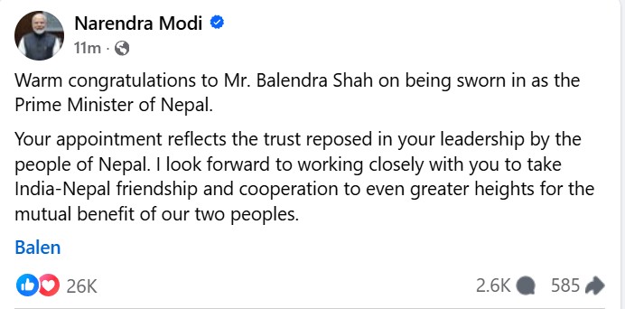 काठमाडौं, १३ चैत्र । भारतीय प्रधानमन्त्री नरेन्द्र मोदीले नेपालका नवनियुक्त प्रधानमन्त्री बालेन्द्र शाहलाई बधाई दिएका छन् । प्रधानमन्त्री शाहले आजै पद तथा गोपनियताको शपथ लिएका छन् ।