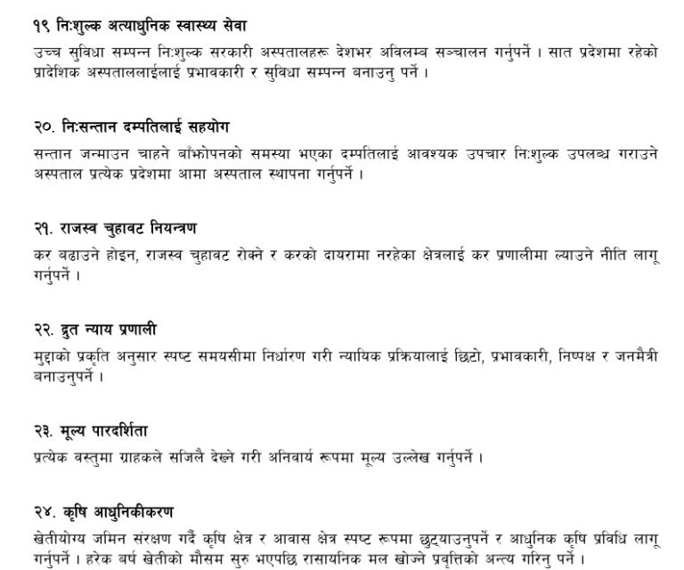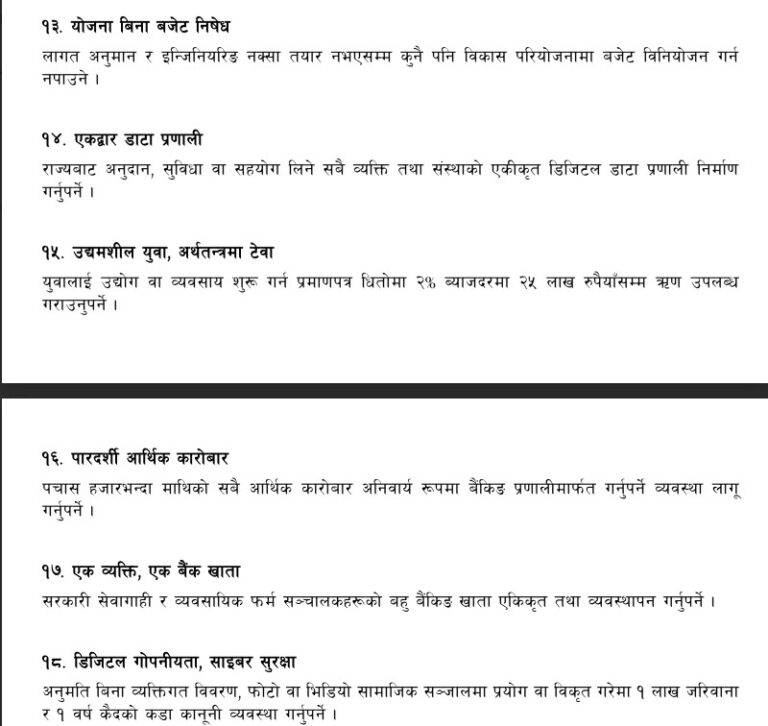 उनले प्रधानमन्त्री बालेन शाहलाई शिक्षा र स्वास्थ्य निःशुल्क गर्नको लागि निर्णय गर्न पनि सुझाव दिए । उनले अब युवाहरुलाई गाउँगाउँमा विकास पुर्याएर रोजगारी दिनुपर्नेमा बताए । वडा सदस्यदेखि सिंहदरबारको कुर्सीमा बस्ने सबैको सम्पत्ति छानबिन गरेर सार्वजनिक गरिनुपर्ने र अकुत सम्पत्ति कमाउनेहरुको सम्पत्ति राष्ट्रियकरण गरिनुपर्ने उनको भनाई छ । एक साताभित्र सम्पत्ति विवरण सार्वजनिक गर्न पनि बालेन सरकारका सबै मन्त्रीहरुलाई सुझाव दिए । सबै सांसदहरुको सम्पत्ति सार्वजनिक हुनुपर्ने उनको मत छ ।