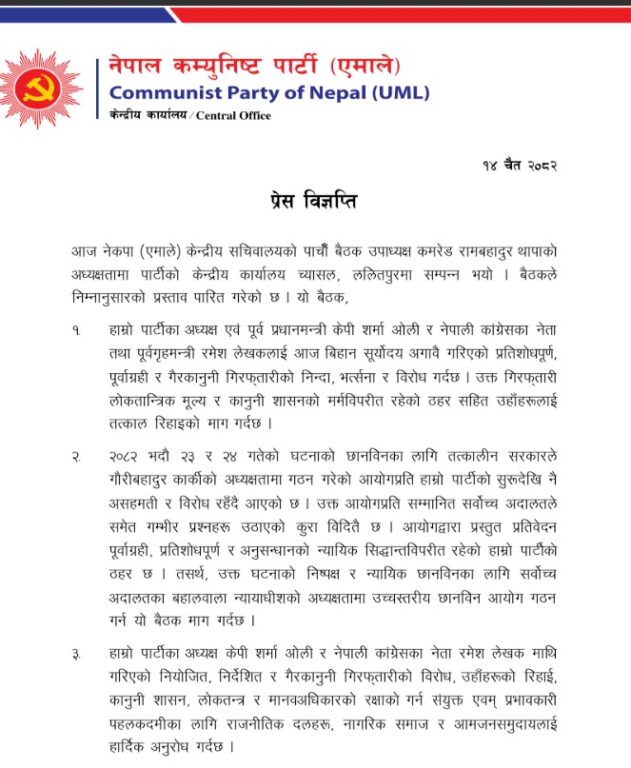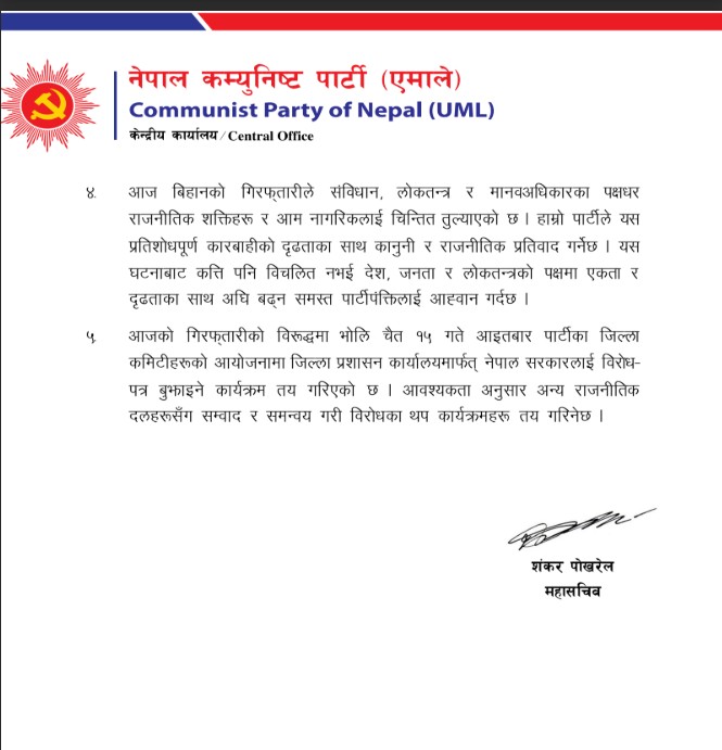 महासचिव शंकर पोखरेलले बैठकले पार्टी अध्यक्ष एवं पूर्वप्रधानमन्त्री केपी शर्मा ओली र नेपाली कांग्रेसका नेता तथा पूर्वगृहमन्त्री रमेश लेखकलाई शनिबार बिहान सूर्योदय अगावै गरिएको प्रतिशोधपूर्ण, पूर्वाग्रही र गैरकानुनी गिरफ्तारीको निन्दा, भर्त्सना र विरोध गरेको जानकारी दिए । उनकाअनुसार बैठकले ओली र कांग्रेस नेता रमेश लेखकको गिरफ्तारी लोकतान्त्रिक मूल्य र कानुनी शासनको मर्मविपरीत रहेको ठहर गरेको र उनीहरू दुवै जनाको तत्काल रिहाइको माग गरेको छ ।