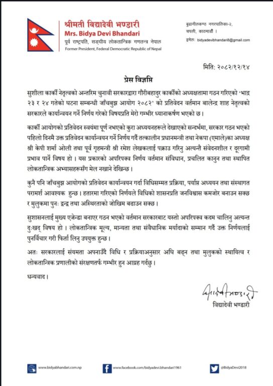 आज एक विज्ञप्ति जारी गर्दै उनले सरकारको यस निर्णयलाई अपरिपक्वताको संज्ञा दिँदै यस्ता निर्णयले वर्तमान संविधान, प्रचलित कानून तथा स्थापित लोकतान्त्रिक अभ्यासहरुसँग मेल नखाने पनि टिप्पणी गरेकी छिन् ।