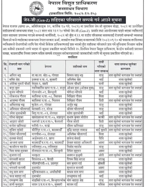 सोही व्यवस्थाबमोजिम ऊर्जा, जलस्रोत तथा सिँचाइ मन्त्रालयमा जेनजी सहिद परिवारका सदस्यबाट रोजगारीका लागि निवेदन पेस गरेका थिए। सहिदका परिवारले प्राप्त गर्ने सुविधा ती २७ जनाबाहेक अरु कसैको हकदाबी लाग्ने भएमा यो सूचना प्रकाशित भएको मितिले ३५ दिनभित्र प्राधिकरणको काठमाडौंस्थित केन्द्रीय कर्मचारी प्रशासन शाखामा निस्सा प्रमाणसहित सम्पर्क राख्न सकिनेछ।