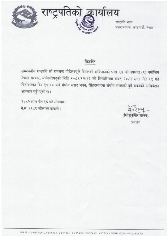 राष्‍ट्रपति पौडेलले नेपालको संविधानको धारा ९३ को उपधारा (१) बमोजिम नेपाल सरकार, मन्त्रिपरिषद्को आजको सिफारिसमा संवत् २०८२ साल चैत १९ गते बिहीबारका दिन दिउँसो २ बजे बजे संघीय संसद भवन, सिंहदरबारमा संघीय संसदको दुवै सदनको अधिवेशन आह्वान गरेका हुन् ।
