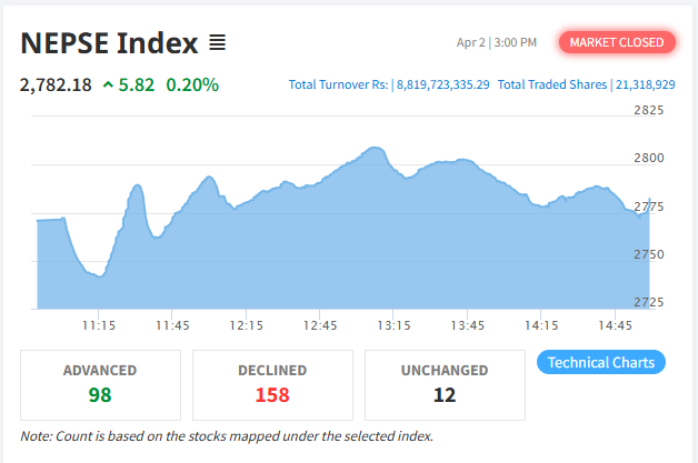 काठमाडौँ, १९ चैत । साताको अन्तिम कारोबार दिन बिहीबार नेप्से परिसूचक सामान्य सुधारसहित बन्द भएको छ। अघिल्लो दिन उच्च अंकले घटेको बजार यस दिन ५.८२ अंकले बढेर २७८२.१८ विन्दुमा पुगेको हो।