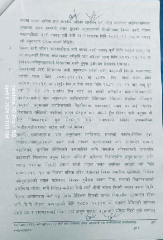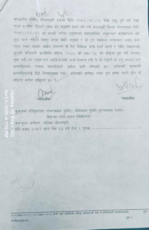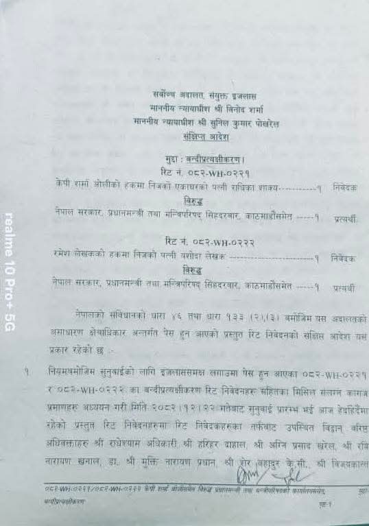 सर्वोच्चबम न्यायाधीशद्वय विनोद शर्मा र सुनिल कुमार पोखरेलको संयुक्त इजलासले आज (सोमबार) काठमाडौं जिल्ला अदालतबाट पछिल्लो पटक थपिएको ५ दिनको म्याद २५ गते सकिने भएकाले सो अवधिभित्र अनुसन्धान सकेर वा म्याद सकिएलगत्तै ओली र लेखकलाई हिरासतमुक्त गर्न परमादेश जारी गरेको हो ।