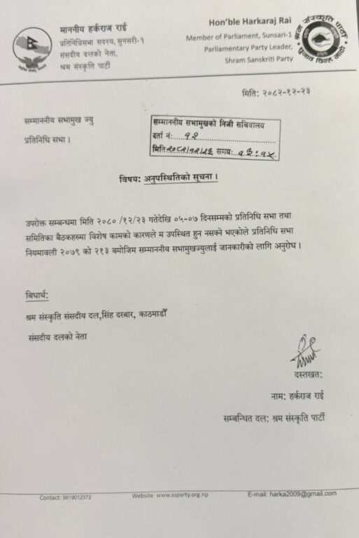 प्रतिनिधिसभा नियमावली २०७९ को नियम २१३ बमोजिम उनले आफ्नो अनुपस्थितिबारे सभामुखलाई पूर्वजानकारी गराएका हुन् । सांसद राईले आफ्नो दल श्रम संस्कृति संसदीय दल, सिंहदरबारलाई पनि यसको बोधार्थ दिएका छन् ।